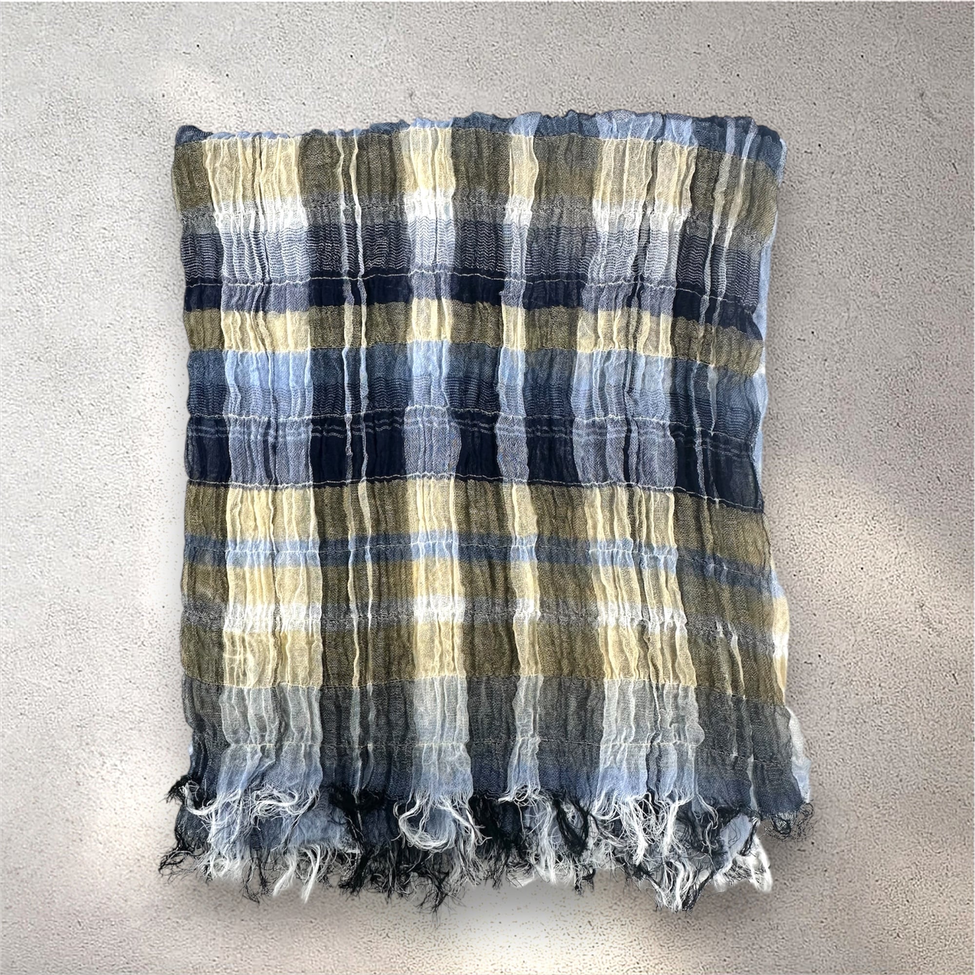 糸の段階でいろいろな色に染め、その糸から織り上げた織物です。水がとても綺麗だからこそ出来ます。