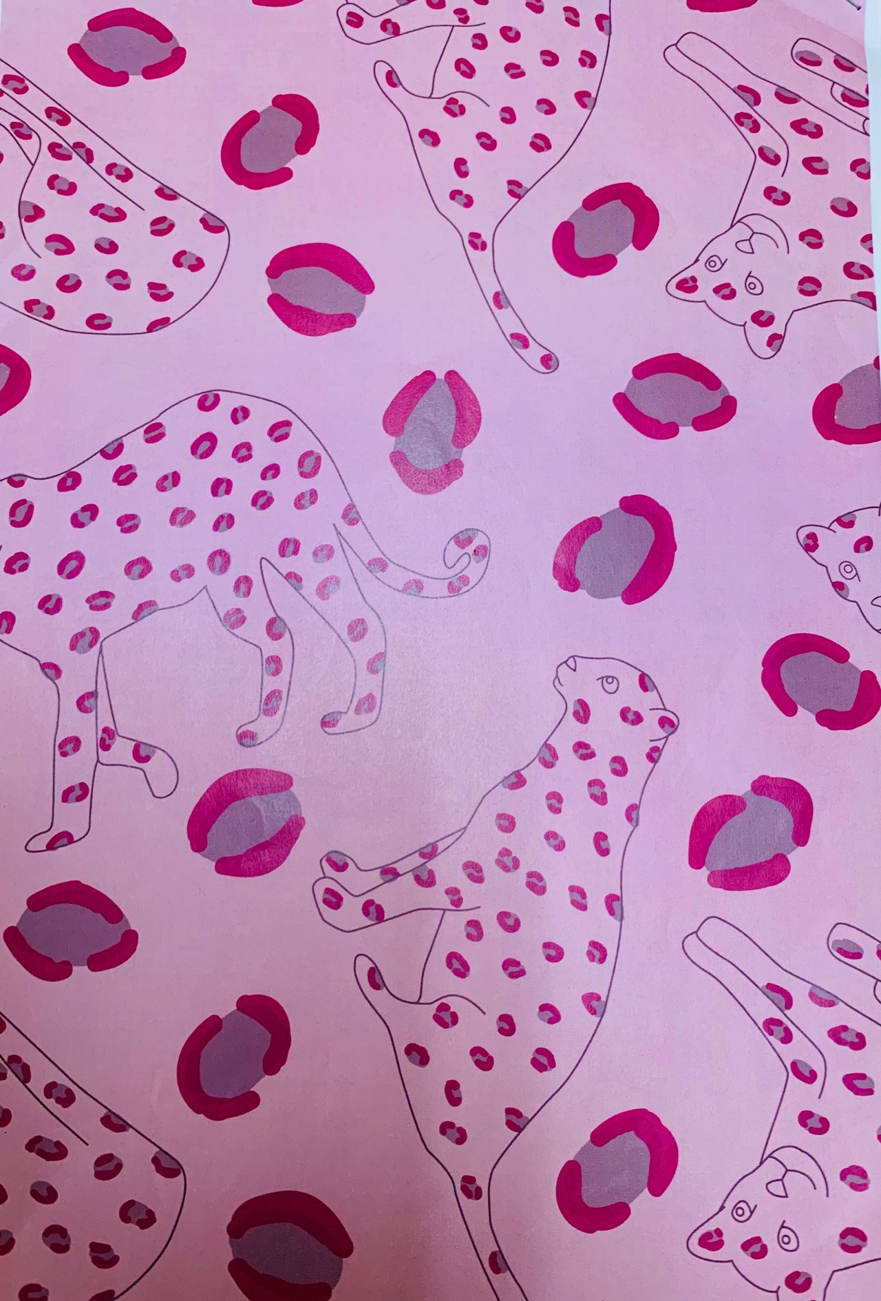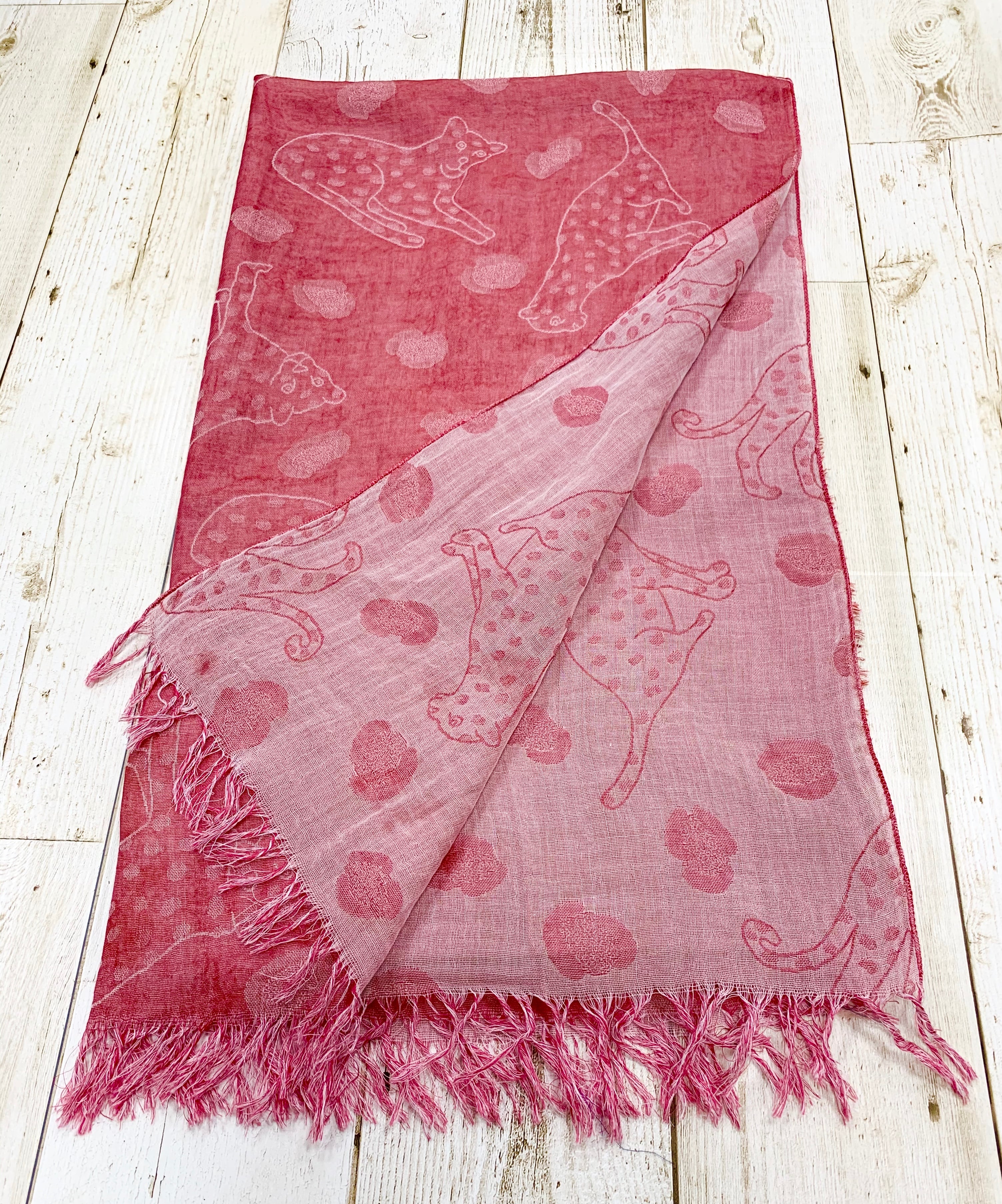 ポーズの違うヒョウを3匹デザインし、間に大きなヒョウ柄を配置して大小のヒョウ柄がある賑やかなデザインです。 ヒョウ柄の中にヒョウ柄!とっても斬新。フェミニンなのですが、ストールの色によって大人っぽいコーディネートにもマッチします♪