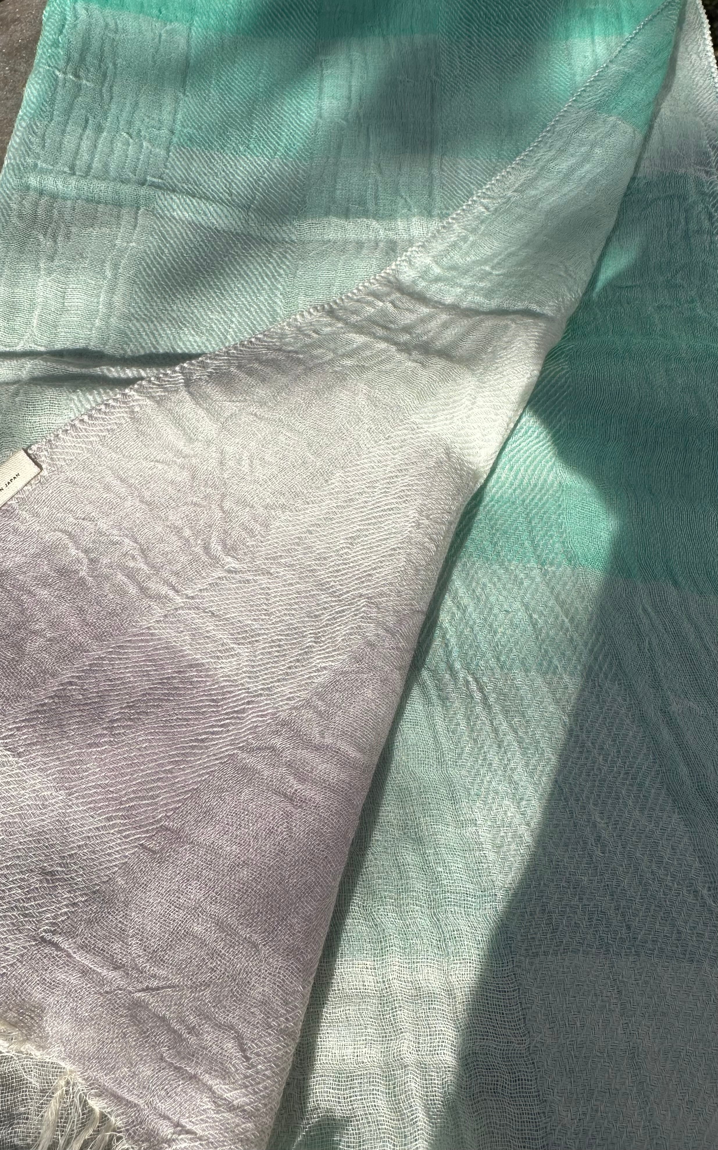 糸の段階でいろいろな色に染め、その糸から織り上げた織物です。水がとても綺麗だからこそ出来ます。